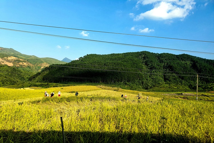 Đoàn lên xe tiếp tục cuộc hành trình đến với Mù Cang Chải. Trên đường du khách ngắm những bậc thang vàng óng trải dài tít tắp, theo những triền núi. Dọc đường du khách có thể dừng chân chụp ảnh, tận hưởng cảm giác giữa mùa vàng Mù Cang Chải.