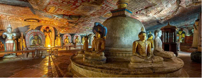 Điểm hấp dẫn chính được trải ra trong 5 hang động, có chứa các bức tượng và tranh ảnh liên quan đến Đức Phật và cuộc sống của Ngài, trong đó nổi bật nhất là những bức tượng Phật mạ vàng cao đến hơn 15m với đủ các tư thế và các bức họa phủ kín vách đá trong một khu hang động rộng đến 1.951 mét vuông. Nơi đây được Unesco công nhận là Di sản văn hóa Thế Giới. Ăn tối và nghỉ đêm tại khách sạn 4* ở Kandy.